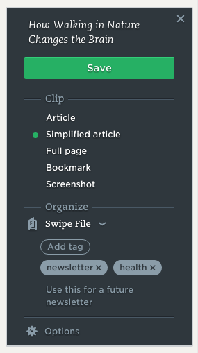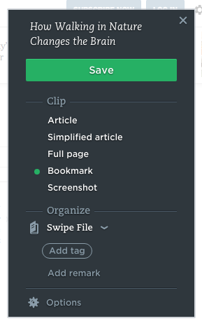Say you're reading an article or tweet, watching a video or listening to a podcast. From that page, just click the browser extension or use the keyboard shortcut ` (it's the little tick above the Tab key). Set your default notebook — I call mine "Swipe File" — in the browser extension settings, and select "Bookmark."