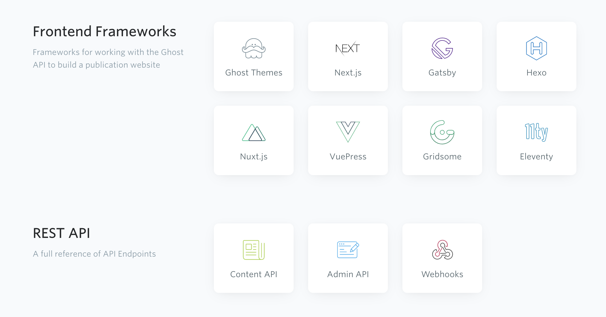 This new architecture unlocks content management that is fundamentally built via APIs, webhooks and frameworks to generate robust modern websites. We've expanded everything Ghost can do in this space as a headless CMS, including detailed content APIs, admin APIs and custom integrations.
