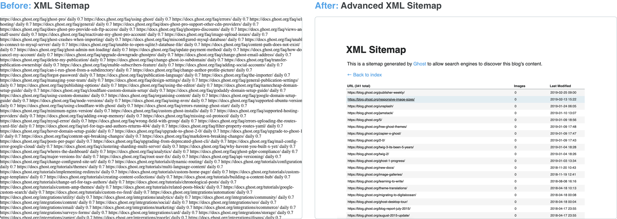 The default Gatsby sitemap plugin generates a simple blob of raw XML for all your pages. We wanted to take this one step further for our docs site and emulate the advanced sitemap structure that we use on all Ghost publications by default.