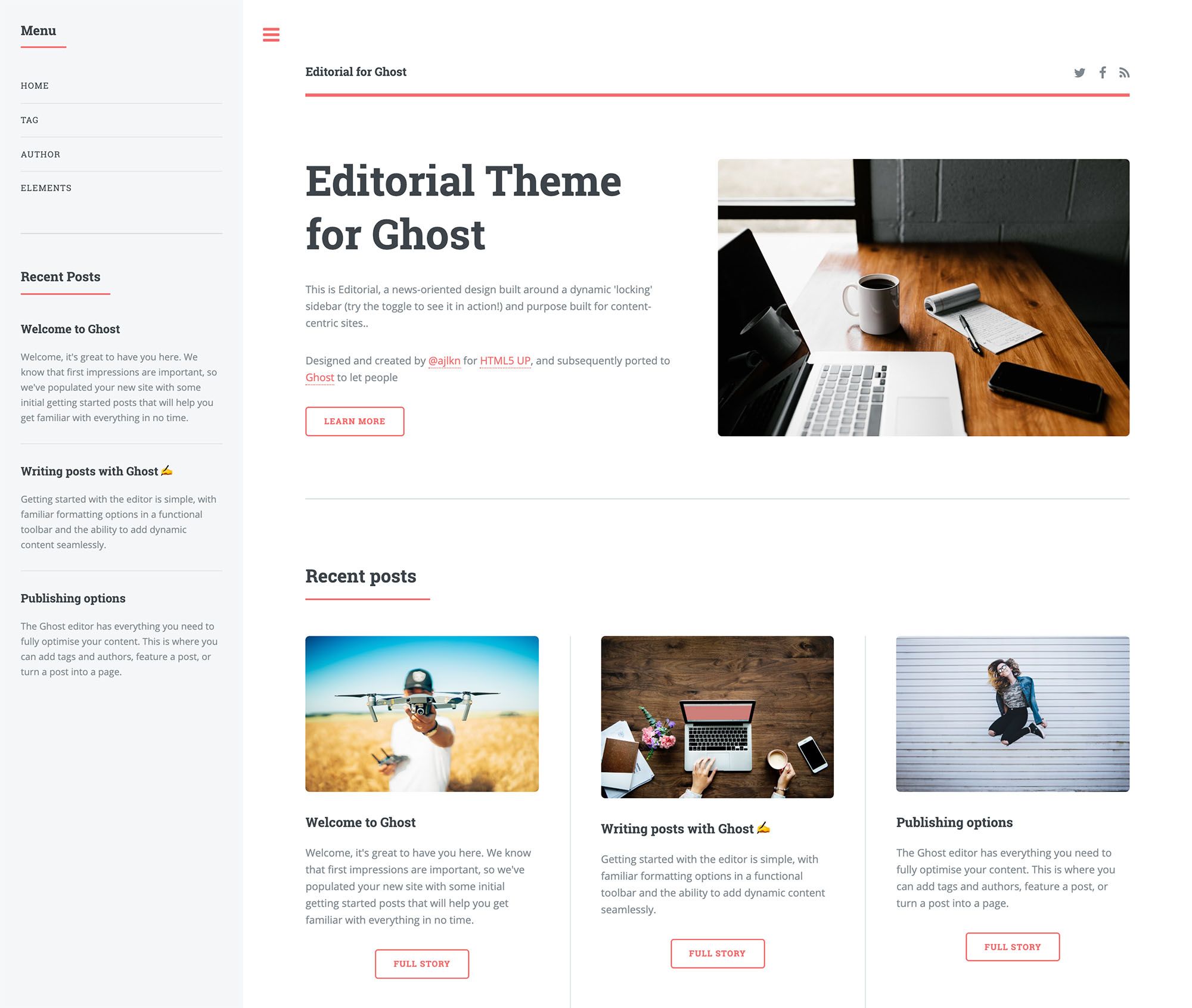 The Editorial theme was also ported from HTML5 UP with a news-oriented design and a 'locking' sidebar. It's great for content-centric publishers who want a neat editorial design.