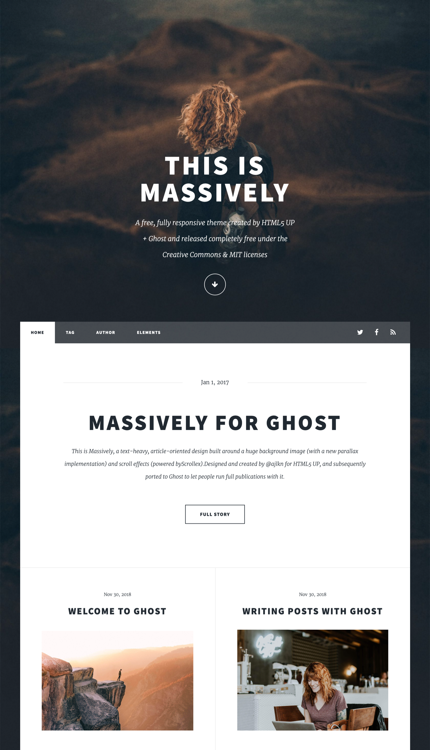 Massively is a fully responsive, article focused design which is built around a large feature background image. The theme was designed by @ajlkn for HTML5 UP and ported to Ghost as a free theme with Creative Commons & MIT licenses, making it highly customisable.