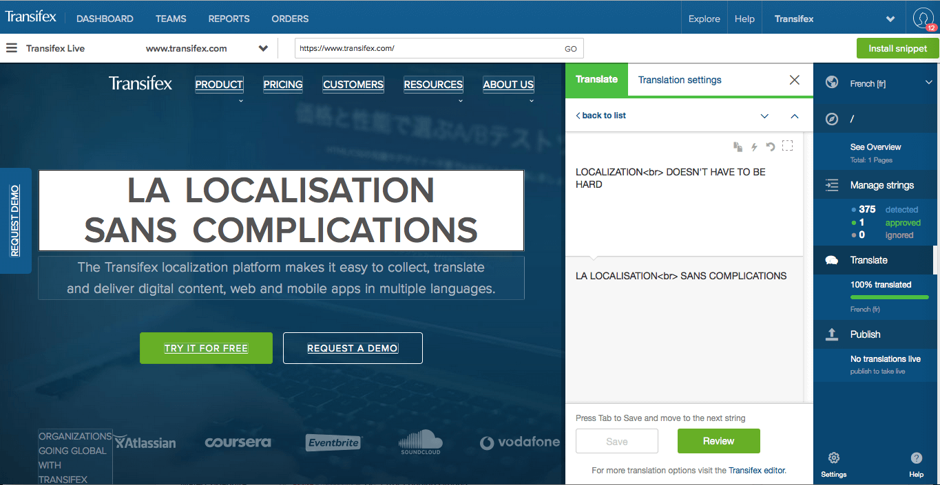 Then, in the Transifex Dashboard you (or, more likely, somebody else) can start translating each string and submit it for review.
