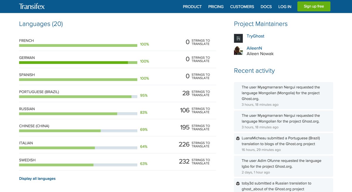 Being an open source project which is largely built and supported by its community, it was really important for us to do this in a way which would be open for everyone to participate in. We didn’t just want to release a few localisations of our site, we wanted to open it up to be translated by anyone. (The same thing we hope to do for Ghost itself, in future!)