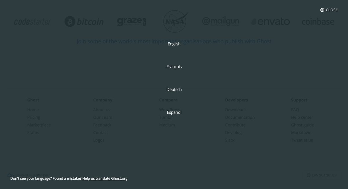 Having done all of this, you can now see it all in action on Ghost.org. German is the first language that we have fully translated, but thanks to Transifex’s Crowdsourcing feature, there are literally hundreds of people translating the site into other languages right now.