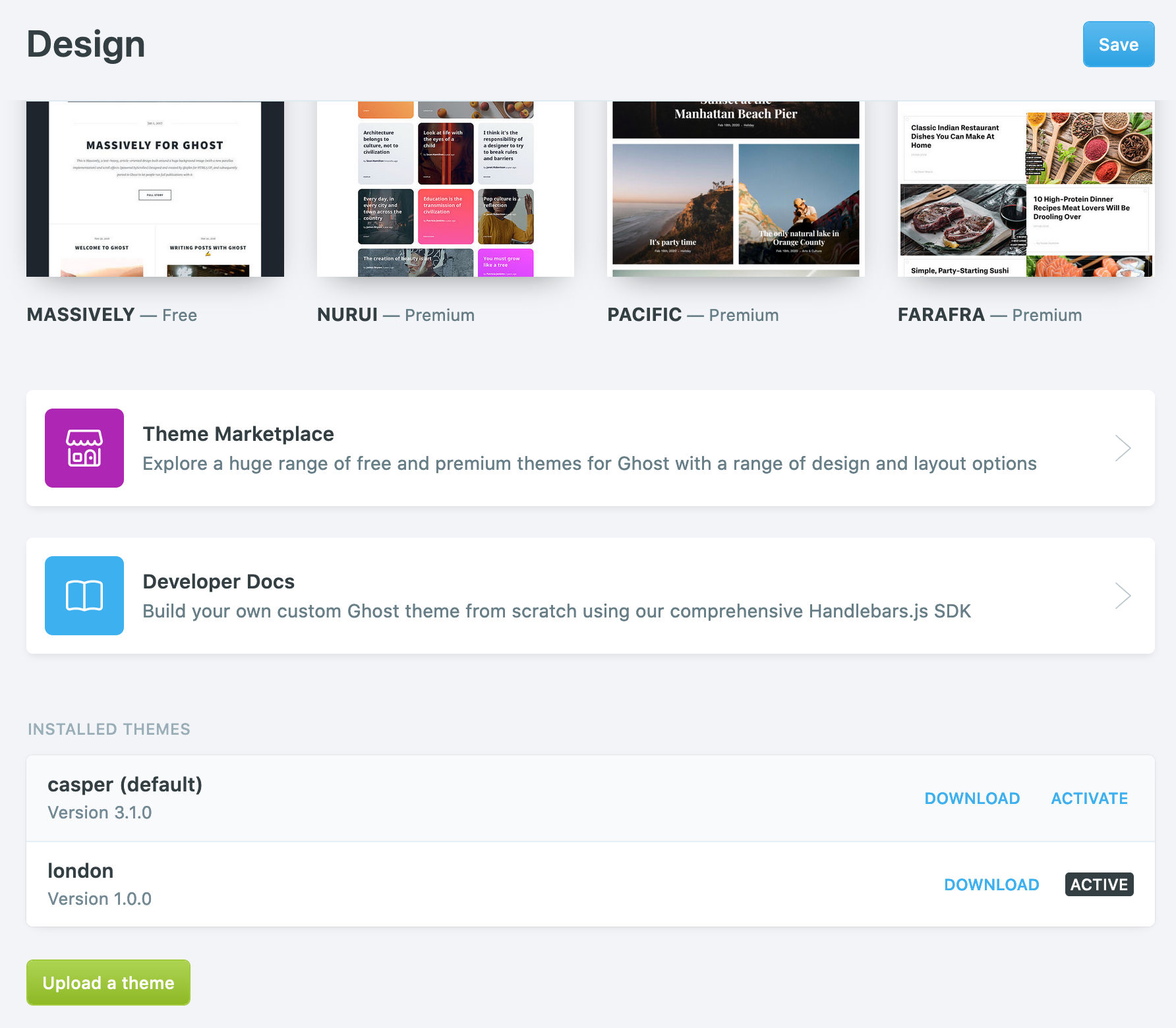 Upload a theme to your publication by clicking the Upload a theme button and activate it once uploaded. Themes should always be in .zip format. That's all there is to it, your site will now render using your new theme.