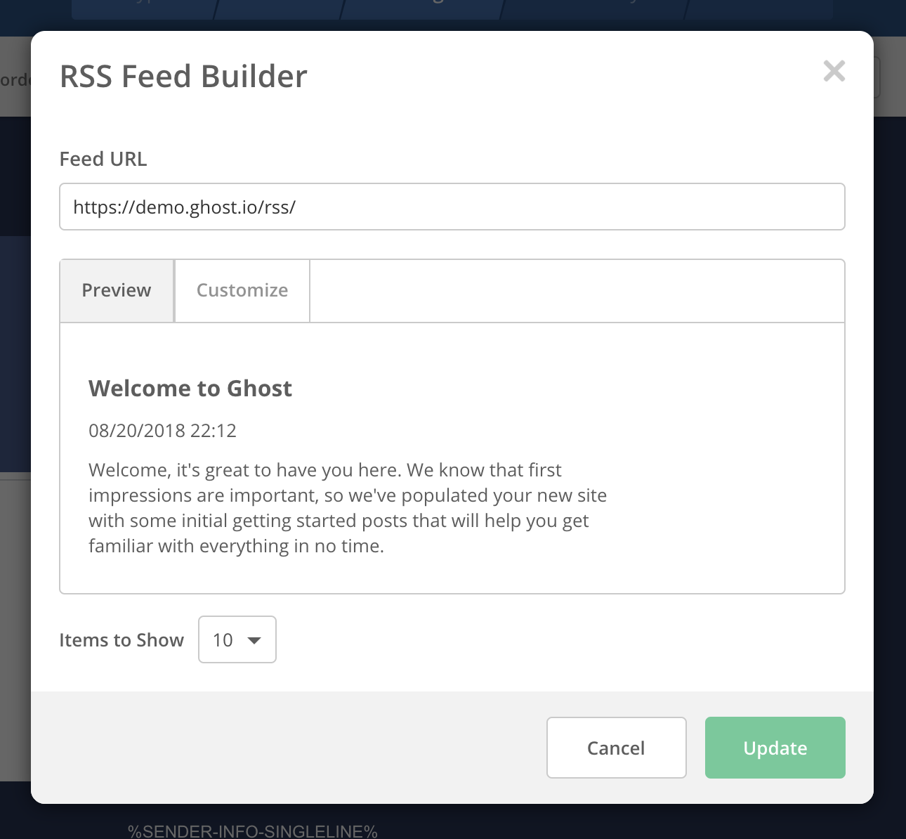 Then select the RSS feed you'd like to use in your newsletter. Don't forget: You can add /rss/ to most URLs in Ghost to get a custom RSS feed. Here are some demo examples: