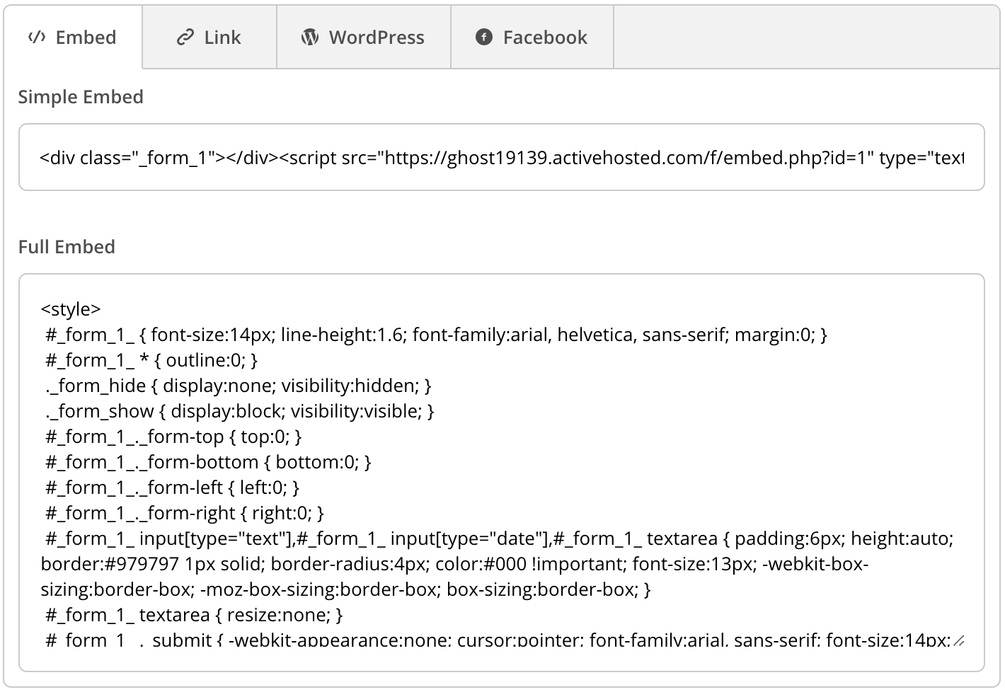 First you'll need to create a new signup form for your ActiveCampaign list. select the options you'd like to use, and copy the code provided. You can use either the Simple Embed or the Full Embed - they both do the same thing, but the Full Embed allows you to customise the code if you want to.
