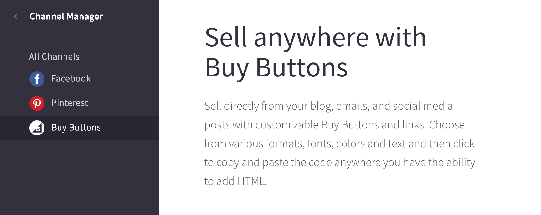In order to create embeddable versions of your range of products, you'll first need to add the Buy Button in the channel manager within the BigCommerce dashboard.
