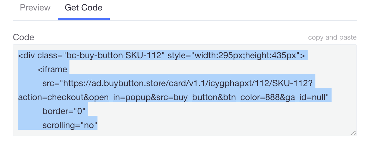 Once you're happy with your Buy Button for your product in the preview, navigate to the get code screen and copy the snippet provided to your clipboard: