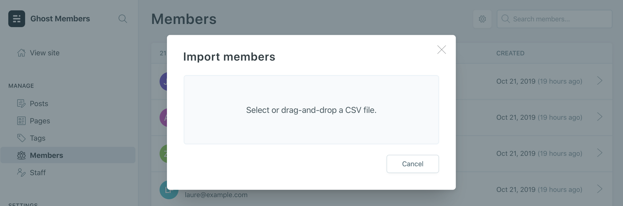 Once your CSV adheres to Ghost's import format, login to your site's admin and click the settings icon in the members dashboard to import your file: