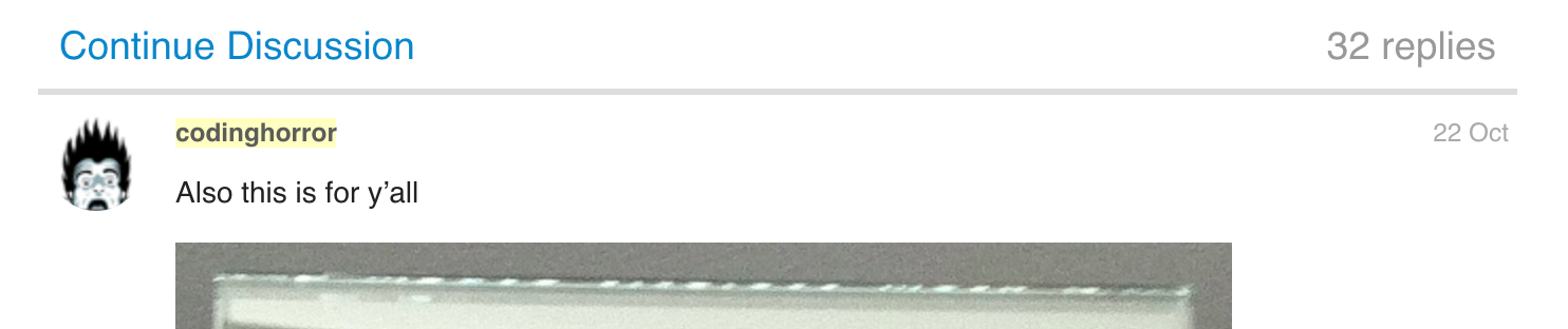 Once you've done this, all that's left is to update your active theme by uploading a fresh .zip in Ghost Admin in the Design settings. The next time your existing posts are visited, the Discourse thread will be created, and you'll be able to see the comments function at the bottom of your posts. Here's an example of what it looks like on Coding Horror's site: