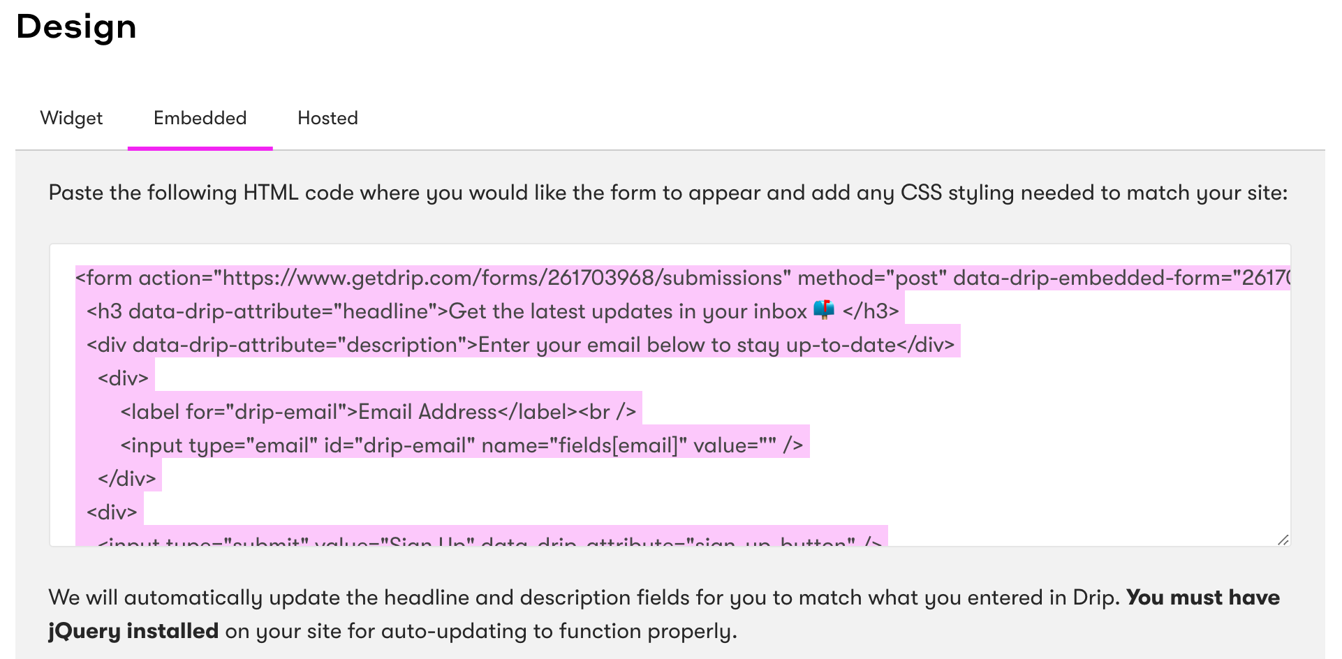 Embed Drip email subscription forms