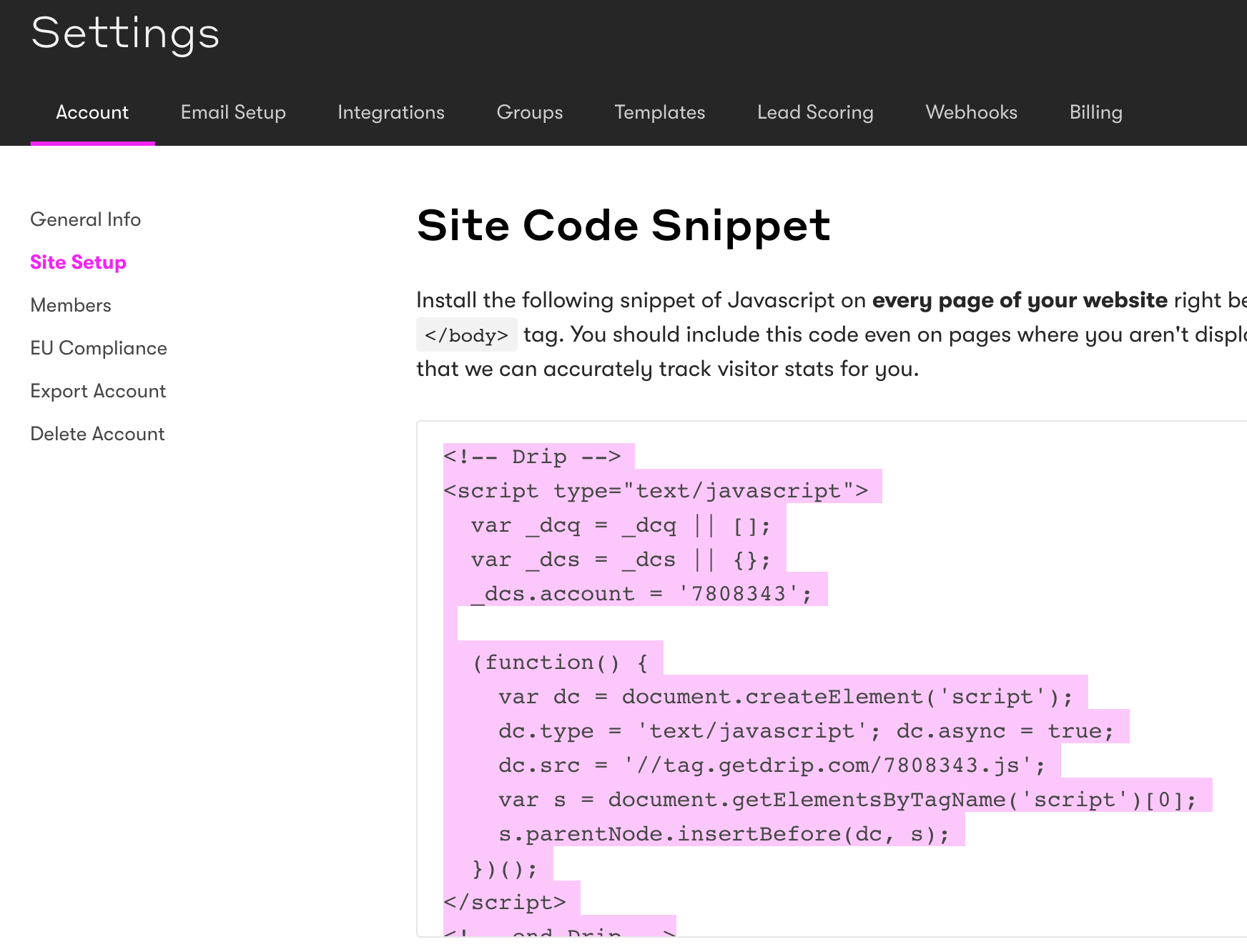 If you'd like to use the Drip widget forms on various parts of your site, go to your account settings in Drip and copy and paste the Javascript snippet in the site setup menu: