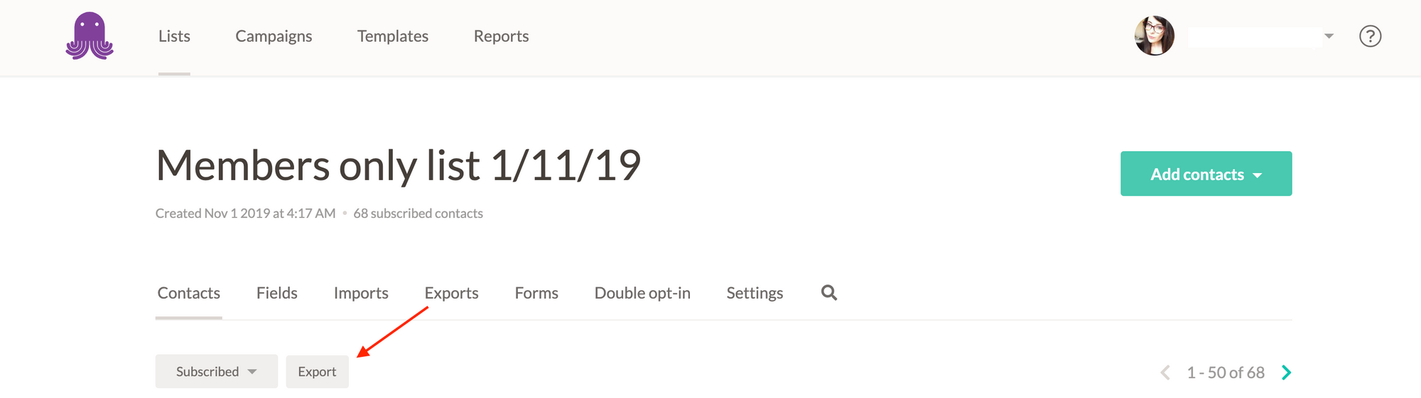 In your EmailOctopus account, navigate to the list of emails you'd like to import to Ghost members. Once you're done, click Export.
