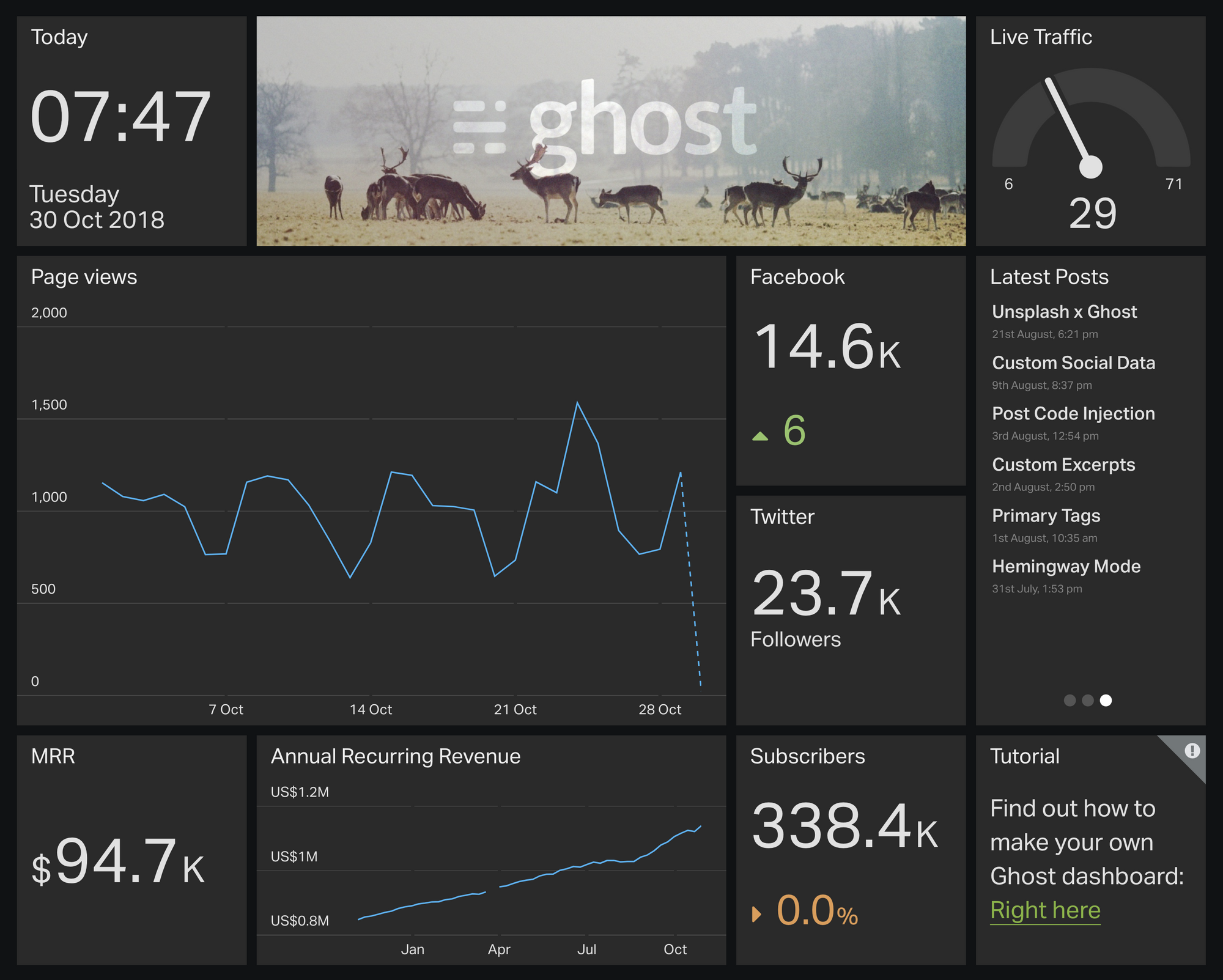 Years ago when Ghost was just a seed of an idea, we imagined building a dashboard of site data so that publishers could view all of their statistics inside Ghost Admin. That turned out to be a very complex feature to build, though, and in the mean time our friends over at Geckoboard built an entire company to comprehensively solve the problem.