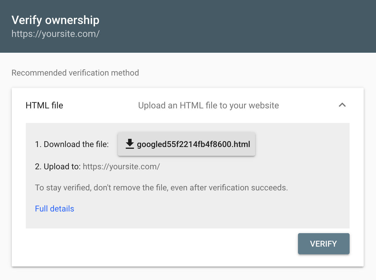 That's it! Once the HTML file has been uploaded in your theme, Google Search Console will be connected to your site. Head back to the Search Console dashboard and click Verify to ensure this has been successful. Now you can start reviewing performance data for your Ghost publication.