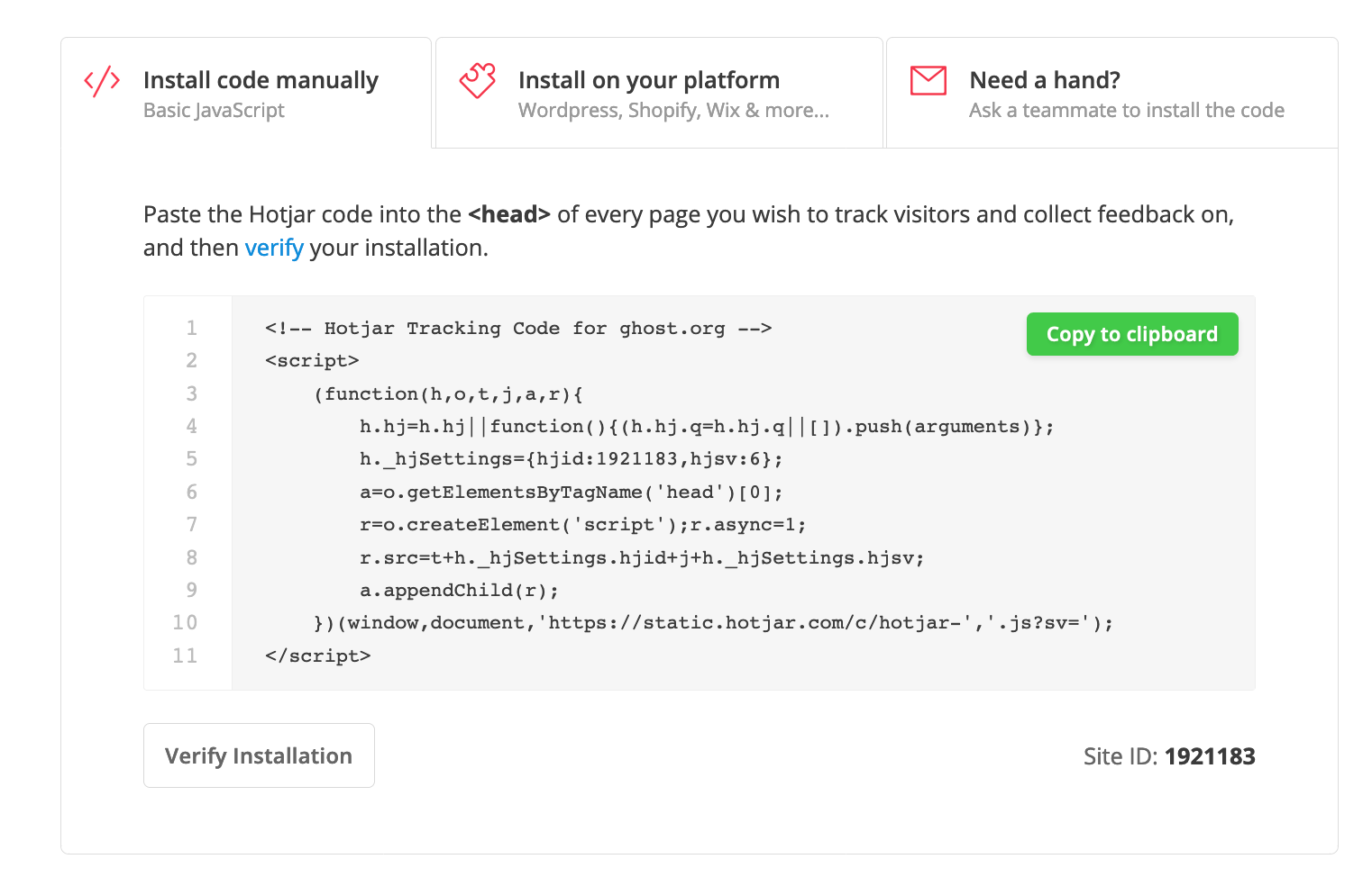 Your site is now fully integrated with Hotjar – you can use the verify installation button to check everything is working as expected. From here, you might want to check out the Hotjar resources to find out how to make the most of the tool.
