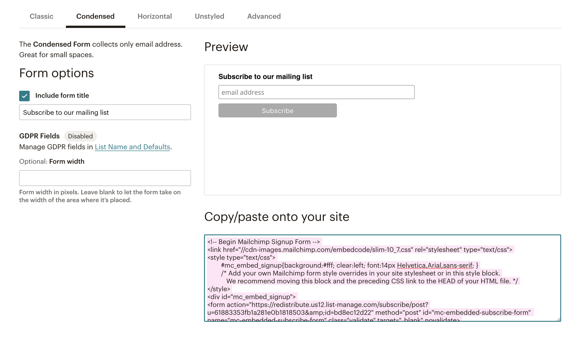 If you'd like to use one of Mailchimp's own subscriber forms directly, that works too! You can use absolutely any of the form builders, popups or other embed options provided by Mailchimp within Ghost.
