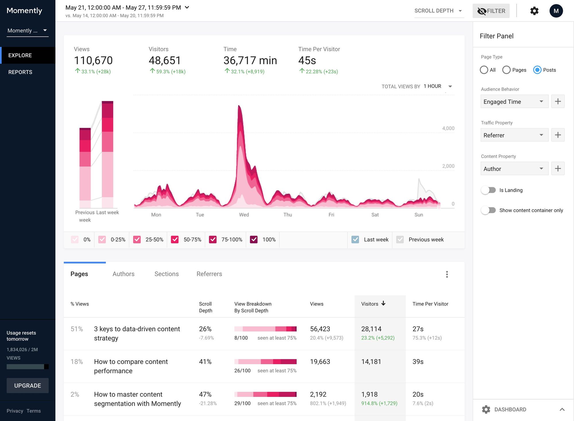 That’s it! Your site is now fully integrated with Momently and you can review your site metrics on the Momently content dashboard at any time! Here's an example of a Momently dashboard: