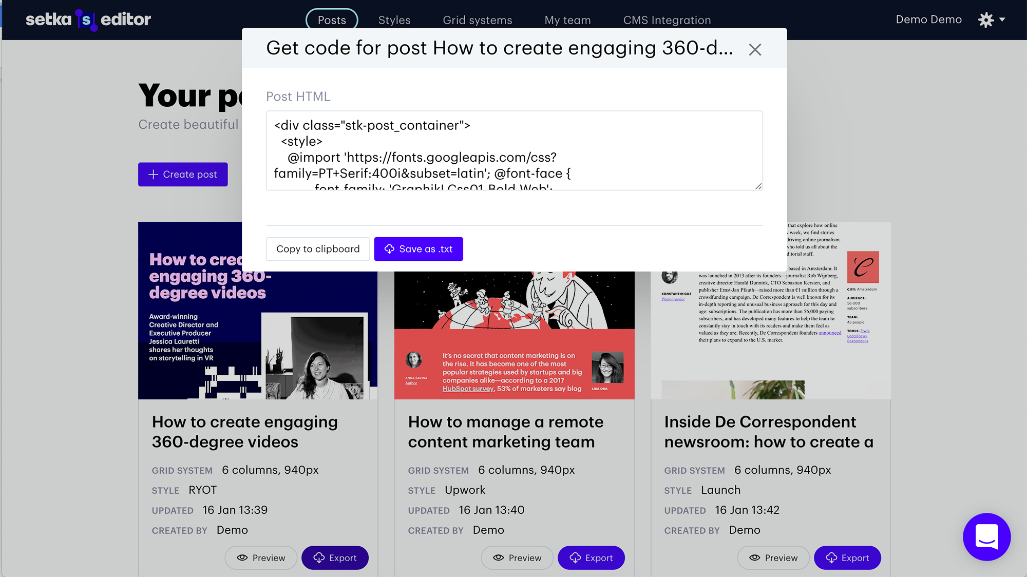 Setka Editor makes it possible for anyone to create standout editorial and branded content with smart design tools that make it easy to design a custom piece of content. Setka Editor users that have the Content Design Cloud plan can integrate structured layouts, art-directed posts or a magazine layout with Ghost in a few simple steps, using HTML code and the Ghost editor.