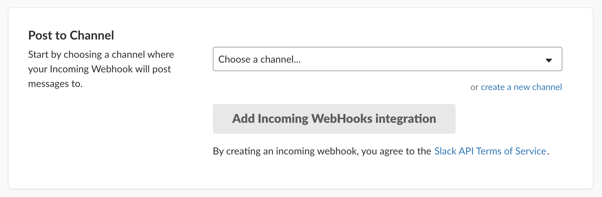 First, you'll need to set up a new incoming webhook in your team's Slack configuration. An incoming webhook is a method for Slack to receive incoming messages to be posted to your Slack team from external services.