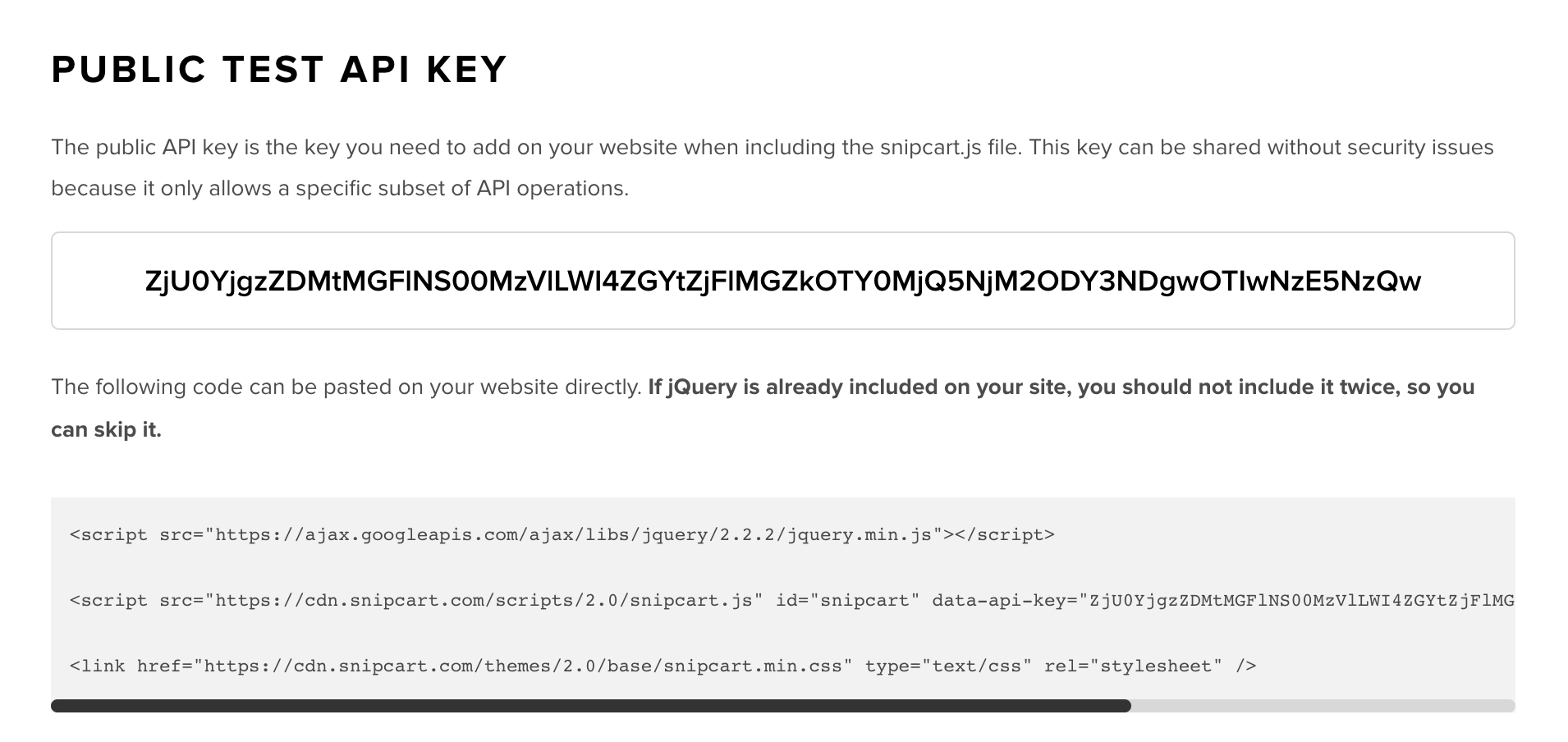 Once you have signed up, grab your code snippet from the Snipcart dashboard which looks like this with your API key in place: