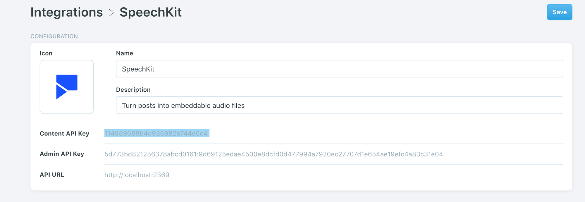 Then head back to SpeechKit and paste your Ghost Content API key into your project: