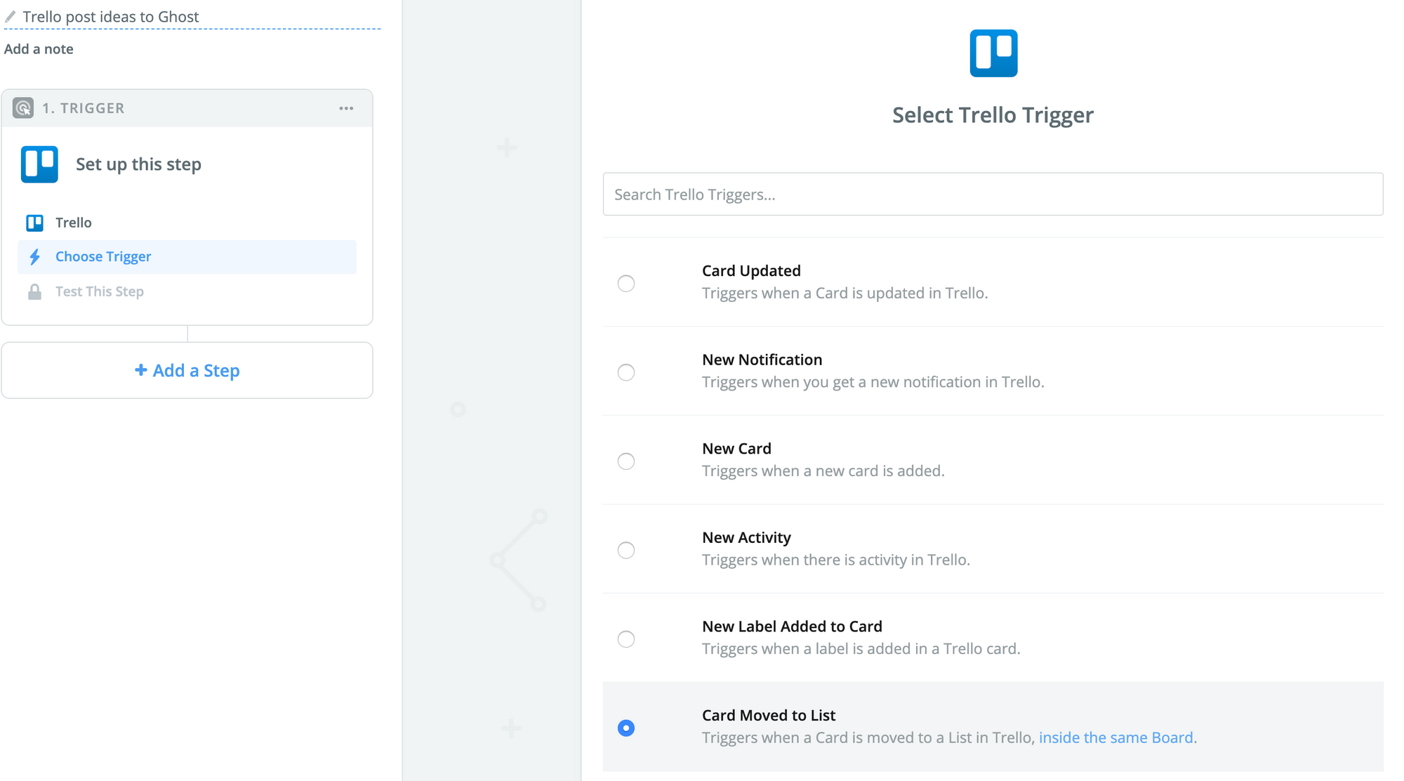 When presented with the list of Trello triggers, choose something that is suitable for your needs. In this example, we're using Card Moved to List, which is useful when moving approved post ideas into a writing or in-progress list on your board:
