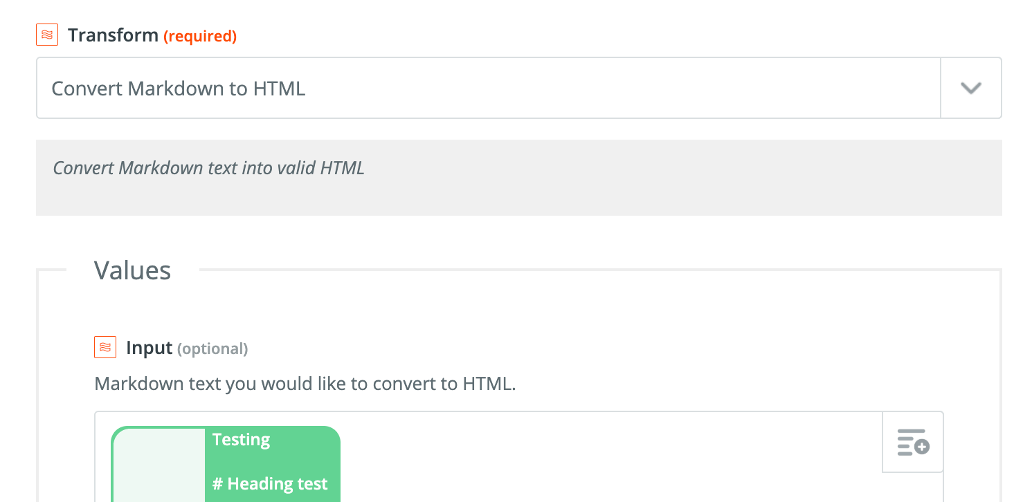 On the next screen, select the Convert Markdown to HTML option and add Card Desc from the dropdown menu for the values input: