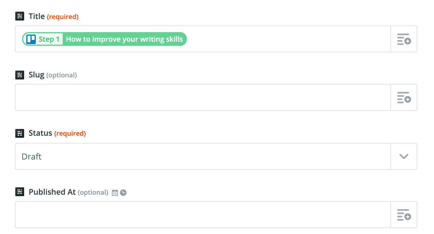 Title– Use the Trello Card titleStatus– Select whether your posts will be drafts, published or scheduled when sent to GhostContent format- Use HTML for this integrationContent (HTML)- Select the field in Trello that will populate your draft post in Ghost. For this example, we'll use the transformed HTML for the card description we just created using the formatter.Authors- Select at least one author for your post using the dropdown menu