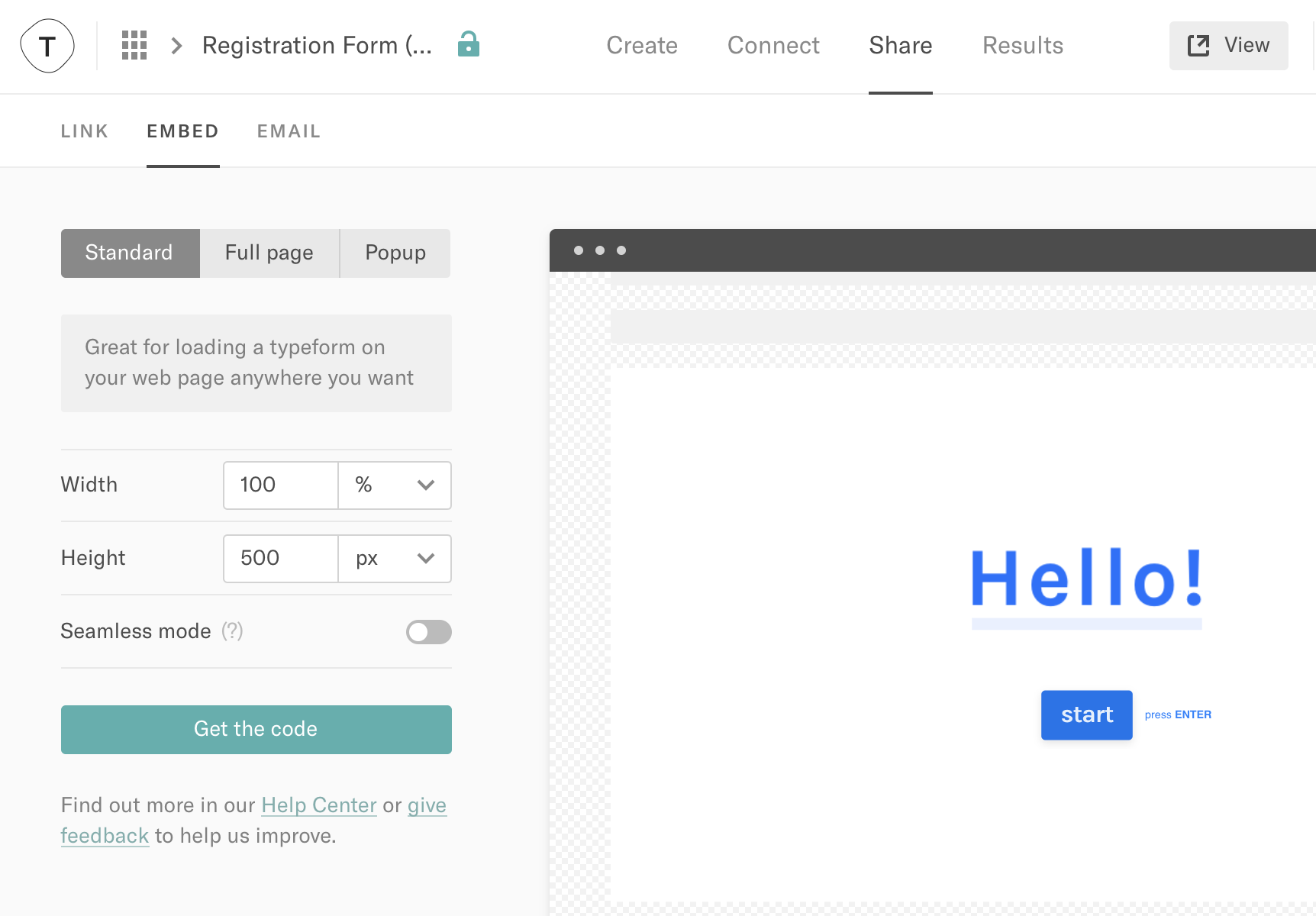 Once you're happy with your form settings, head over to the Share tab of the form builder, and select Embed