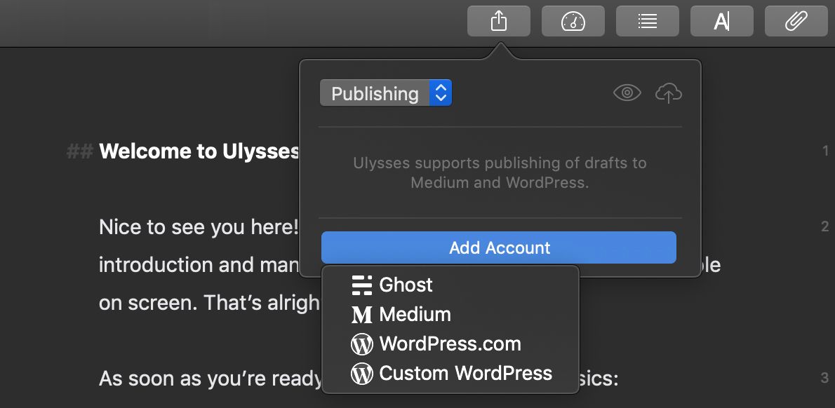 Once you've created some content in Ulysses and you're ready to port it over to Ghost, use the publishing export option from the top navigation menu and select Ghost:
