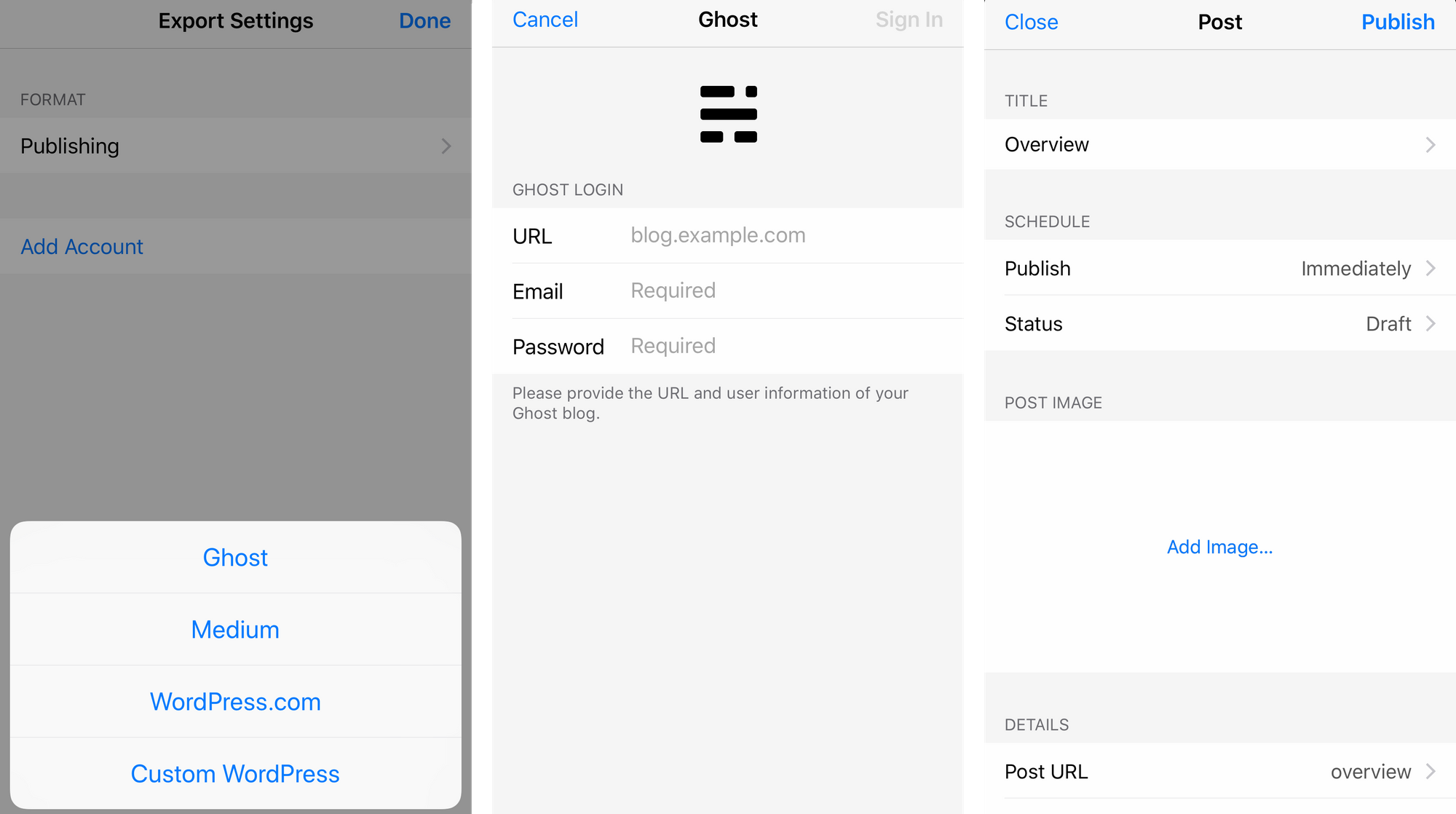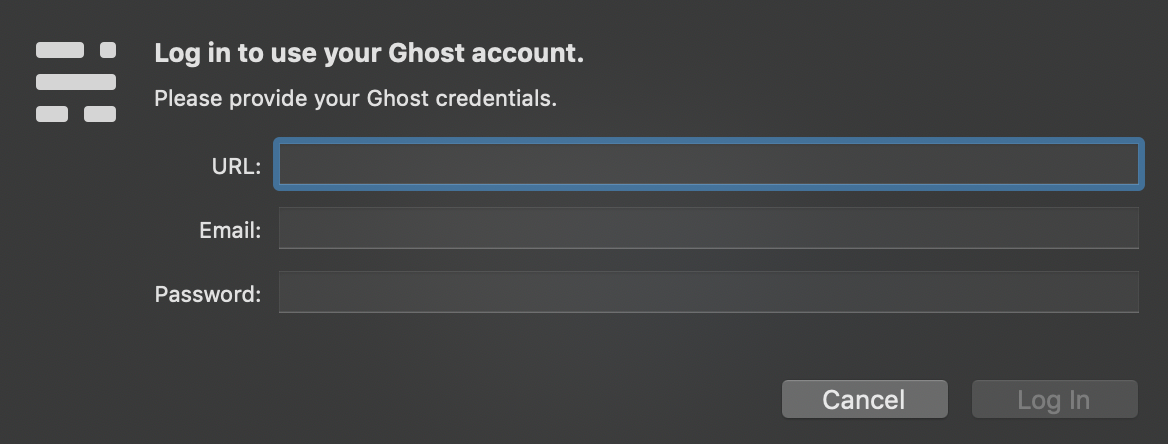 In order to send your writing to your Ghost site now and in the future, you'll need to enter the credentials you use to sign in to Ghost Admin.