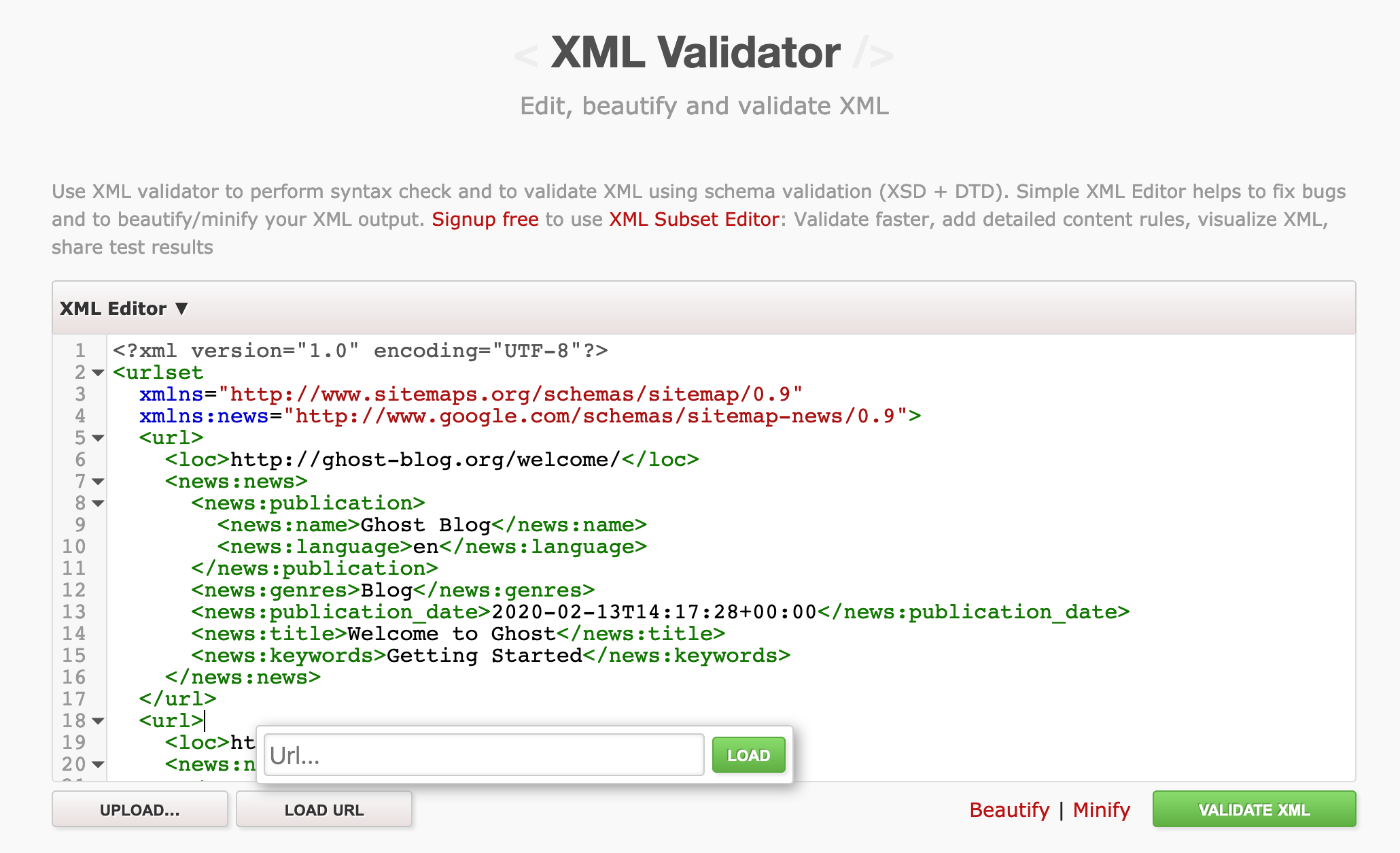 To validate your sitemap has been created successfully use an XML Validator like the one found on Truggo. By clicking 'Load URL' and entering the route we defined above the validator will fetch your sitemap and tell you if it's been formatted correctly.