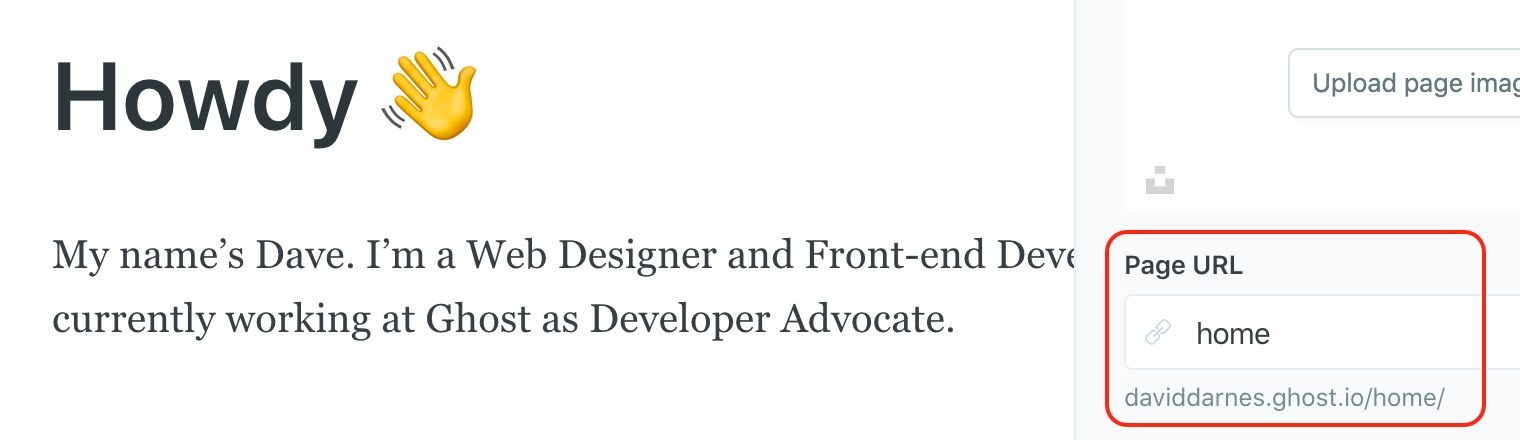 As mentioned before, the handlebars templating lets us render content anywhere in a Ghost theme. For my use case I'd like to create a page called "Howdy " and render that content on my home page. With the use of Routes in Ghost it's possible to designate content data and templates to any URL in the site.