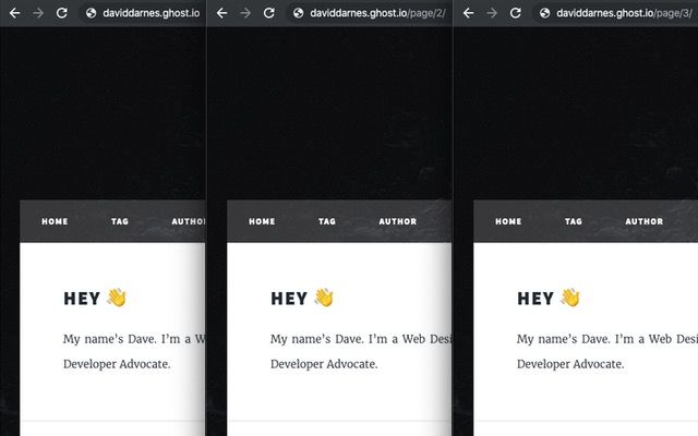 But what if I want a more bespoke home page? The theme I'm using has pagination and those paginated pages use the same index.hbs template to list older posts, so my bio is going to be shown on all those pages too.