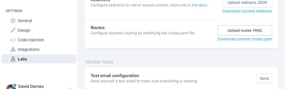 First create a page in Ghost admin with your home page content and set the slug to "home", this will be the unique identifier to reference in your routes file. Next navigate to the Labs view and download your routes.yaml file from the Routes section. After opening it in a text editor it should look something like this:
