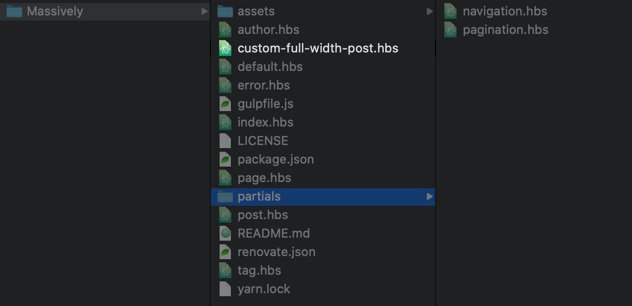 Create a new file within the root theme folder with the prefix of custom-. In this example we're going to use custom-full-width-post.hbs.